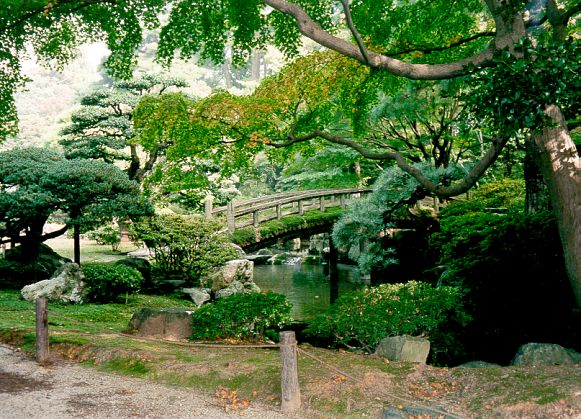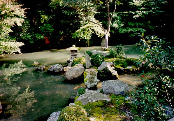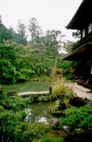 In one of Kyoto's magnificent parks there is the "Temple of the Silver Pavilion", which in fact has never shined with moonlight colours, as its creator – Yoshimasa – once intended. The wooden walls have a warm brown colour that stays in contrast with the whiteness of paper (with which sliding windows and doors are lined) and gypsum (used on some walls). The Silver Pavilion is surrounded by a garden – a small masterpiece employing strictly natural materials such as water, trees, rocks and sand. A small, irregularly shaped pond seems much bigger thanks to the skilful positioning of shrubs and stones on its edges. Walking on a winding path – along tiny bays, miniature rocky shelves with pine twigs bending over water, and islets connected to the shore by flat stone footbridges – you can constantly discover new perspectives. Each stone covered with moss seems to express its individual identity. Trees, bushes, ferns with various shades of green, with different twig shapes, varied leaf and needle patterns; water embracing tufts of grass, glistening in the sun, clear and transparent under rock shelves; gravel on the footpath – it all combines into a perfect landscape. Apart from the natural pond, there is also a "lake of silver sand". Fine, light-grey sand forms a tall, irregularly shaped dune. Waves drawn on its surface with a rake are supposed to reflect the moonlight and diffuse it all over the garden. Next to the dune, there is a small pile of sand symbolising Mount Fuji.
