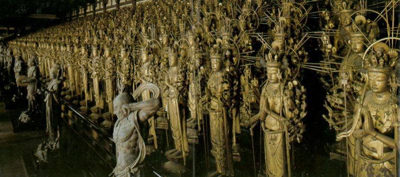 Built in 1164, and later rebuilt in 1266 after a fire, this long edifice houses no fewer than 1001 statues of the Thousand Armed Kannon, standing in five rows. According to Buddhist beliefs, Kannon is a deity that renounced a state of nirvana in order to help people achieve it. The tallest statue is situated in the centre of the room, between two sets of smaller statues (each set totalling five hundred pieces). Contrary to what the name suggests, each Kannon has 40 arms rather than 1000. In Buddhism, 40 arms is equal to 1000, as each contains 25 worlds.