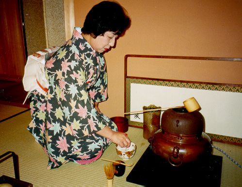 After all necessary utensils are ready, boiling water is poured over a portion of powdered green tea in a bowl, and the drink is mixed with a special bamboo whisk. The tea has a consistency of green milk with foam, and a characteristic sweet and tart taste. I liked it a lot! It is considered polite to slurp while having the last sip to show that the tea was tasty. Finally, taking a close look at the tea bowl is a must. Usually it is a tiny work of art.