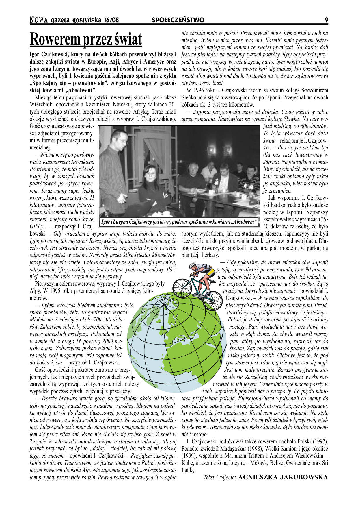 In her article entitled "On a bike across the world", Agnieszka Jakubowska gives account of the lecture delivered by Igor and Lucyna on 1 April, in Absolwent club, Gostyń.