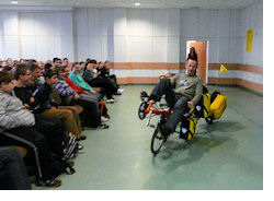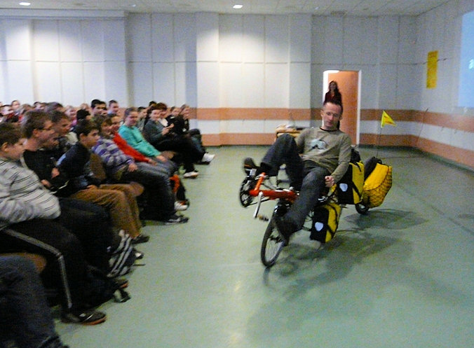 The recumbent bike we showed at the end of the lecture – HP Velotechnik StreetMachine – generated great interest. It was presented fully equipped for a major expedition. Three brave volunteers even took a ride. Round of applause for the Budzyn school for great atmosphere.