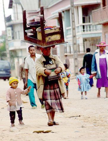 Women have the talent to carry practically anything on their heads. In the photo below you can see a Malagasy lady with a table on her head, plus a bucket and a basket on top of it all.