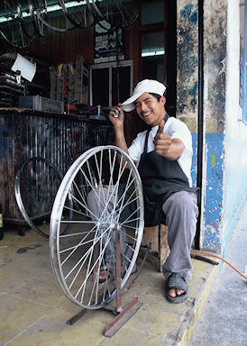 Mexico. A bike repair guy at a shop in Bacalar.