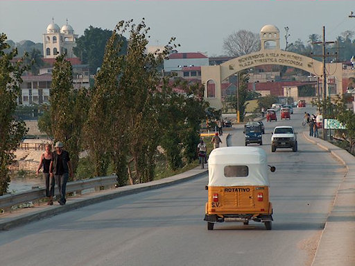 Guatemala. Entering Flores, a city located on an island in Lago de Peten Itza.