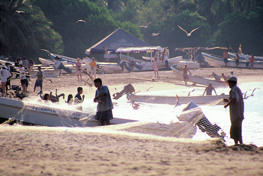 Mexico. Puerto Escondido. Fishermen coming from sea early in the morning. Pelicans are already waiting.