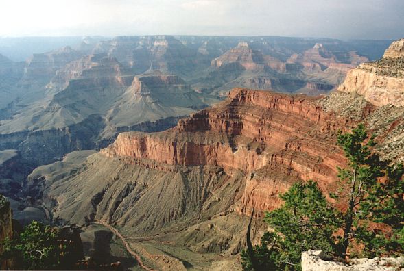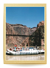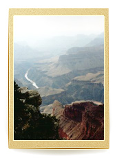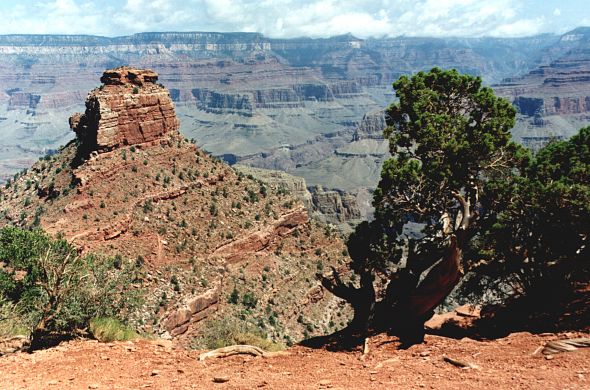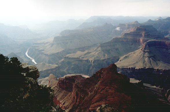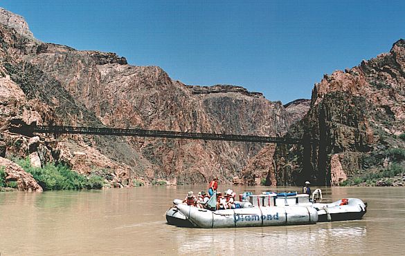 We cycled 15 km from the centre to a place called Hermits Rest, which marks the end of the popular West Rim Drive, with its numerous vantage points. In a Tourist Information Office we were told that cycling further down the Canyon was prohibited. What a shame. There was nothing else left but to walk down. However, some trails were closed that day, being damaged by the storm a night before. We chose Kaibab trail, steep in some places, but definitely doable on a bike. Admittedly, with quite a few tourists on the trail, cycling down would not have been comfortable. We had to do without a crazy downhill ride. We walked down at a fast pace, passing several tourists. Those going in the opposite direction did not look particularly "fresh" – rather sweaty and tired. True, the temperature wasn't pleasant. Scorching heat and no water on the trail, let alone a snack shop. A tourist hostel with the life-giving liquid was all the way down, on the bank of the Colorado River. Anyway, we were well prepared, with 3 litres of water per capita and ample food supply. The guidebook rightly contained information about the risk of sunstroke. Moreover, people warned us against planning a "down & up" trip in just one day. Too much effort, too high temperature, etc. But they did not know how though we are! Half way down we met a park ranger, who told us the same thing – either go straight back up, or go down and stay in the shelter until the next day. We explained that we only wanted to go just a bit further, and promised to return soon. He believed us, but we went all the way down to the river, of course. We crossed a hanging bridge over the Colorado River, whose water was creamy-brown because of the previous day's storm. We found ourselves 900 m below and 16 km away from the Canyon rim. The air stood still. Well, actually it was vibrating due to the heat. Some tourists were preparing themselves for rafting in giant inflatable boats. We were told that in order to try rafting, you have to book a boat at least one year in advance!