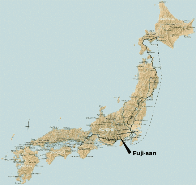 One of the highlights of this tour was an attempt to reach the summit of Fuji-san with our bikes. It proved impossible because – firstly – we discovered the road to turn into a rocky traverse starting at around 3300 m, and secondly – the route was covered with fresh snow which began to fall on exactly the same day, for the first time that year.