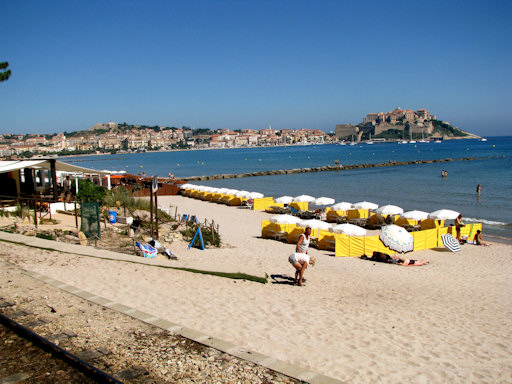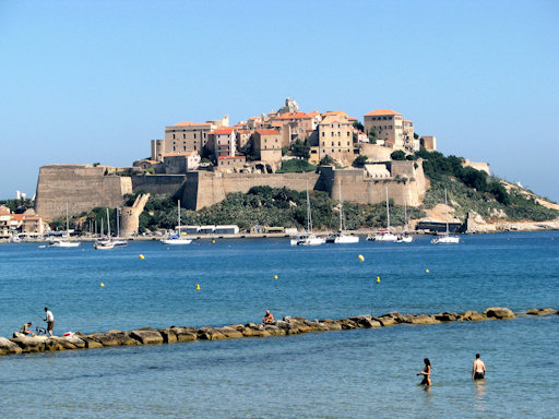 Corsica. Beach in Calvi, with the citadel in the background.