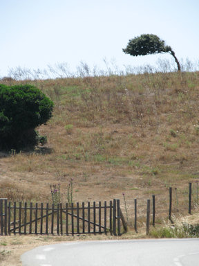 Corsica. Strong winds blowing constantly in the Bay of Sagone prevent trees from growing straight up.