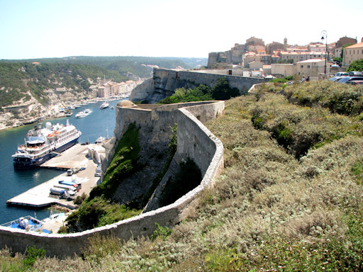 Corsica. Bonifacio. A view of the bay, harbour and the upper city.