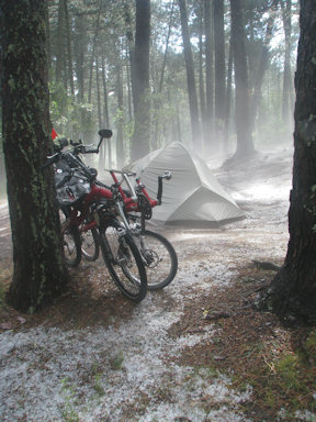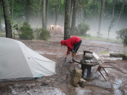 Corsica. Camping site in Zonza - after the hailstorm there was a white, steaming carpet spread on the ground.
